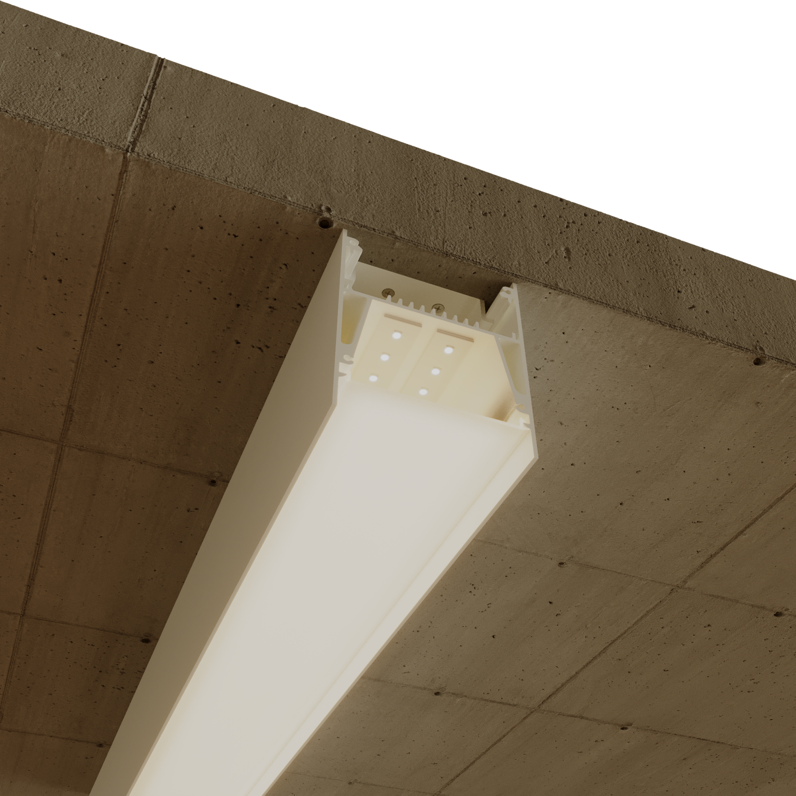 A linha Ecco é composta de dois modelos de perfis lineares com largura de boca de 67mm. O primeiro deles é o modelo de embutir com microborda, enquanto o segundo modelo é de sobrepor, com espaço para embarcar o driver dentro da estrutura da luminária.